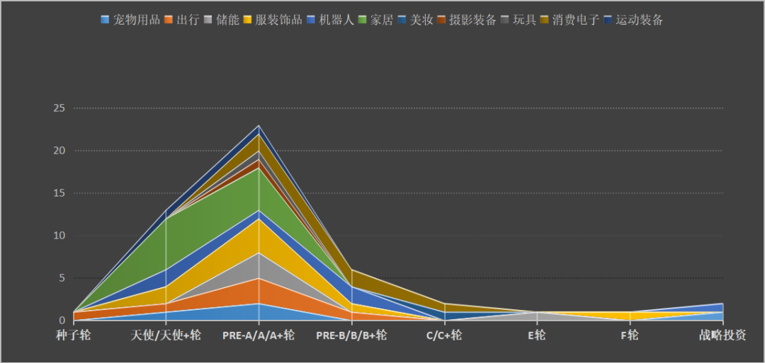机器人赛道则是“两极分化”比较严重,有两个天使轮融资、两个 B 轮融资,以及一个 A 轮融资,其中融资到 B 轮的两个项目分别是水下机器人和 AI 影像机器人,壁垒相对较高,在下文我们也会详细介绍;而宠物用品、出行、储能、服装饰品几个热门赛道呈现出的分布趋势都是更多地集中于 A 轮阶段。