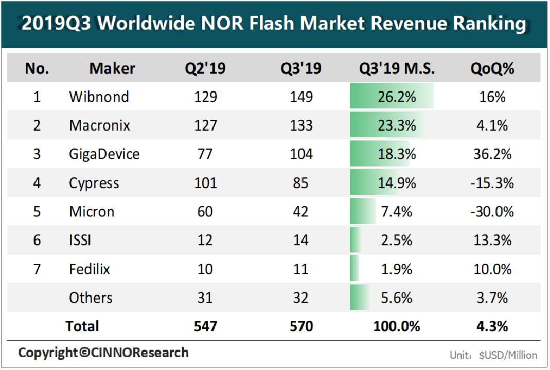 全球90%的NOR Flash市场被旺宏(Macronix)和华邦电子(Winbond)、Cypress(已经被英飞凌收购)、美光和兆易创新这五大厂商占据。高容量NOR Flash市场主要由Cypress和美光把持着,这类产品主要针对汽车、工控和航天应用;旺宏和华邦则以生产中等容量的NOR Flash为主,兆易创新早期依靠低容量产品切入该市场,正在向高端领域前进。旺宏、华邦和兆易创新这三家更专注于消费类电子产品应用市场。