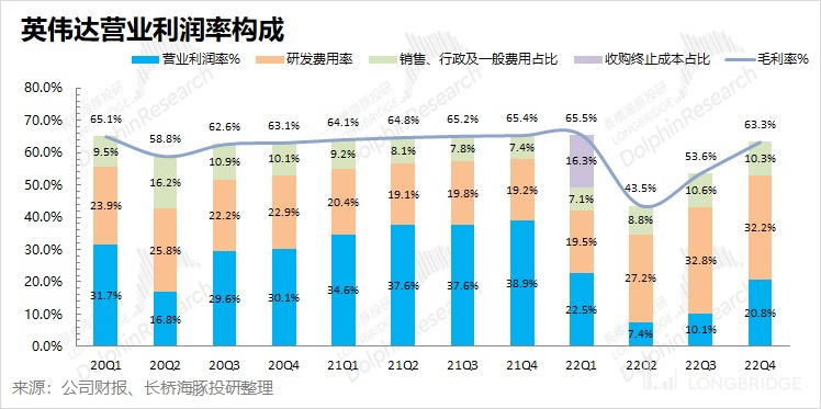 **2)研发费用率:本季度32.2%**,同比上升13pct。主要由于研发费用相对刚性,虽然本季公司营收疲软,但研发费用绝对值不会因此而有较大下降。
