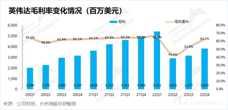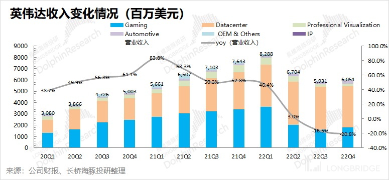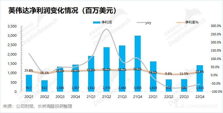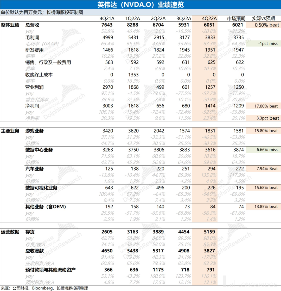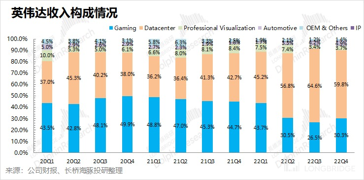 海豚君认为本季度游戏业务的大幅下滑已有预期,但在绝对值上有环比回升。四季度全球PC的销量基本已经回归到了疫情前的水平。作为生活中的常态化使用产品,PC销量继续下降的空间不大。随着游戏显卡的库存危机已基本结束,公司也将重心从“老产品去化”转向“新品”。