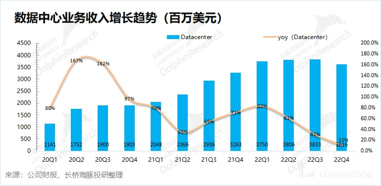 2)本季度数据中心业务的增速跌落至11%,宏观经济对云业务的影响开始显现。随着美国科技大厂收缩开支,公司数据中心业务高增不在。