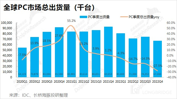 ①全球PC市场在四季度仍然低迷,并未出现回暖的迹象。根据IDC最新的数据,2022年四季度全球PC市场出货加速下滑,仍只有6720万台,同比下滑27.5%。而由于显卡在游戏领域的应用主要用于PC端,而在后疫情时期的市场对PC的需求明显回落,同时加之局部地区的疫情管制影响,削弱了市场对游戏显卡的需求;