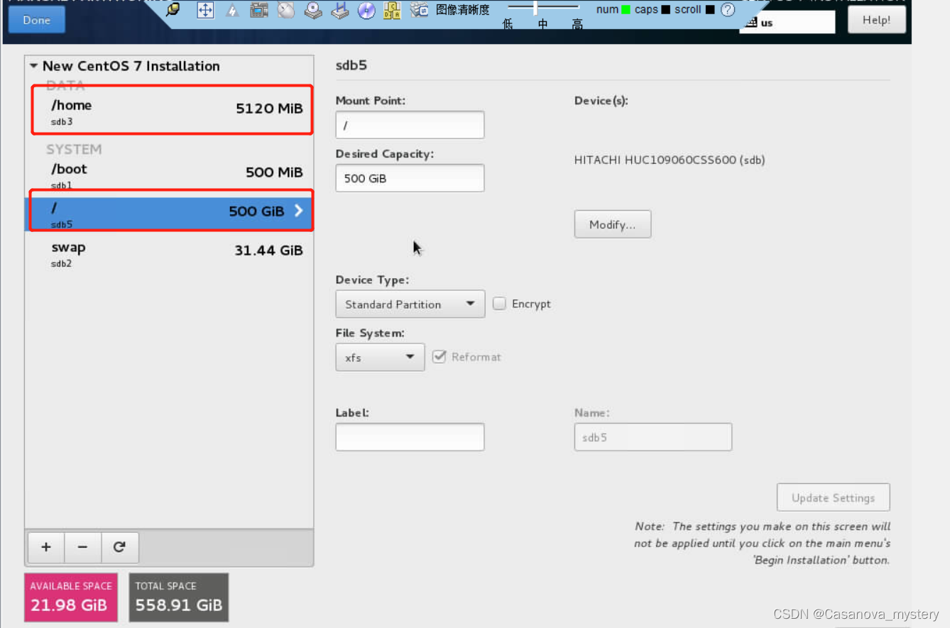 接下来的菜单中注意把/home的空间修改设置成5G(5120M),把/的空间调大为总硬盘量的95%,设置完成后选完点击Done继续