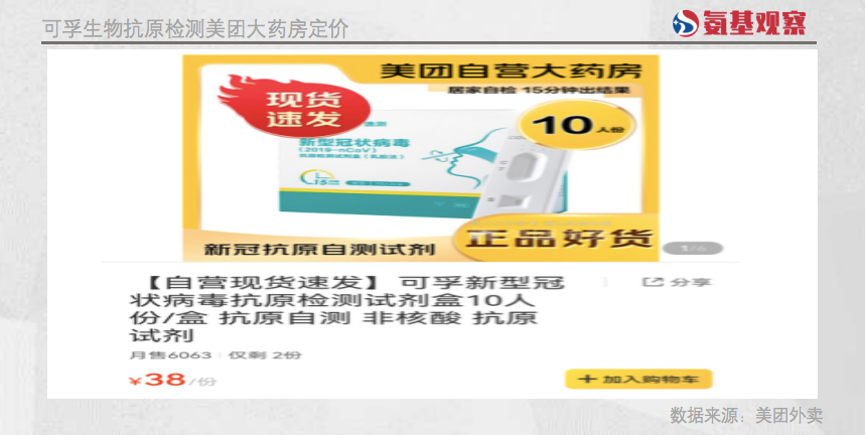 过度内卷的市场难以产生高溢价,抗原检测市场也是如此。如下图所示,可孚生物的抗原检测10人份产品,美团大药房最新定价为38元,即单价仅有3.8元/个。