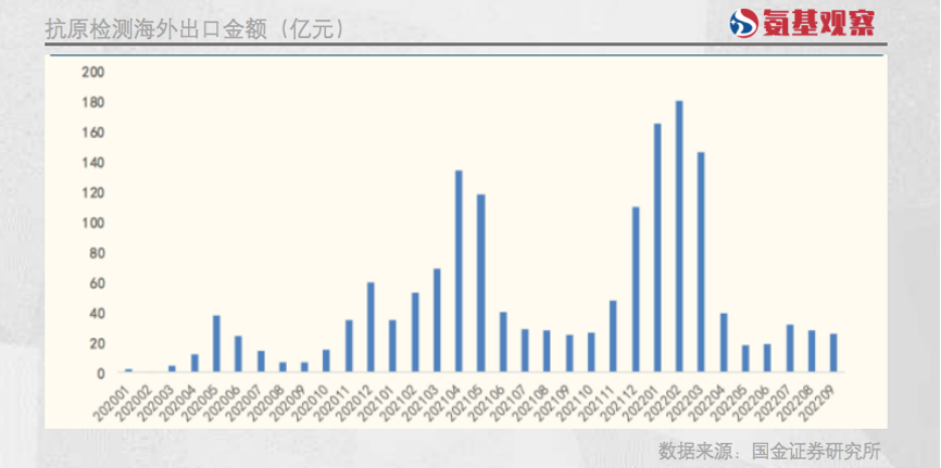 如下图所示,在2022年的1、2、3月份,我国抗原月出口额均超140亿元。
