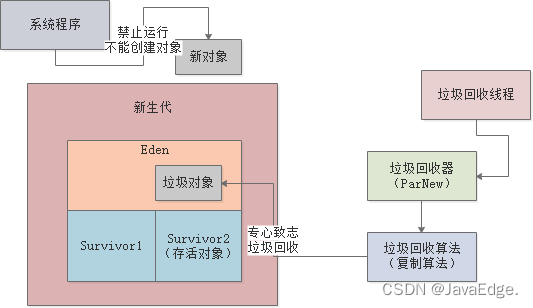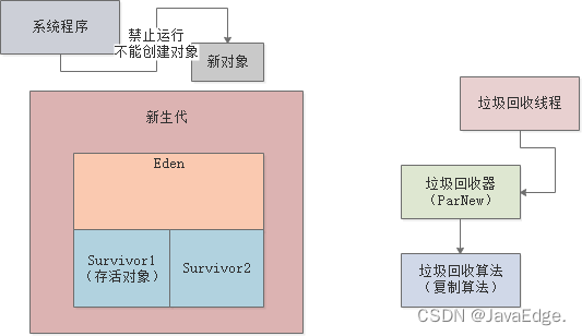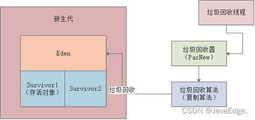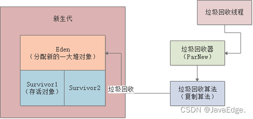 垃圾回收一定会通过一个后台运行的GC线程,如针对新生代用ParNew垃圾回收器,其针对新生代采用复制算法:标记Eden区中的存活对象,然后全部转移到Survivor1,然后一次性清空Eden中垃圾对象: