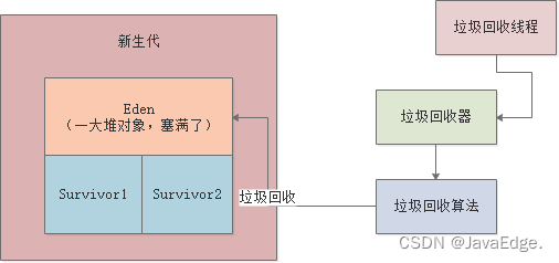 此时必然触发Minor GC,有专门GC线程执行GC,且对不同内存区域有不同垃圾回收器,这相当于GC线程和垃圾回收器配合,使用自己的GC算法对指定内存区域执GC: