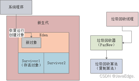 GC完毕,即可继续恢复Java系统的工作线程运行,继续在Eden创建新对象: