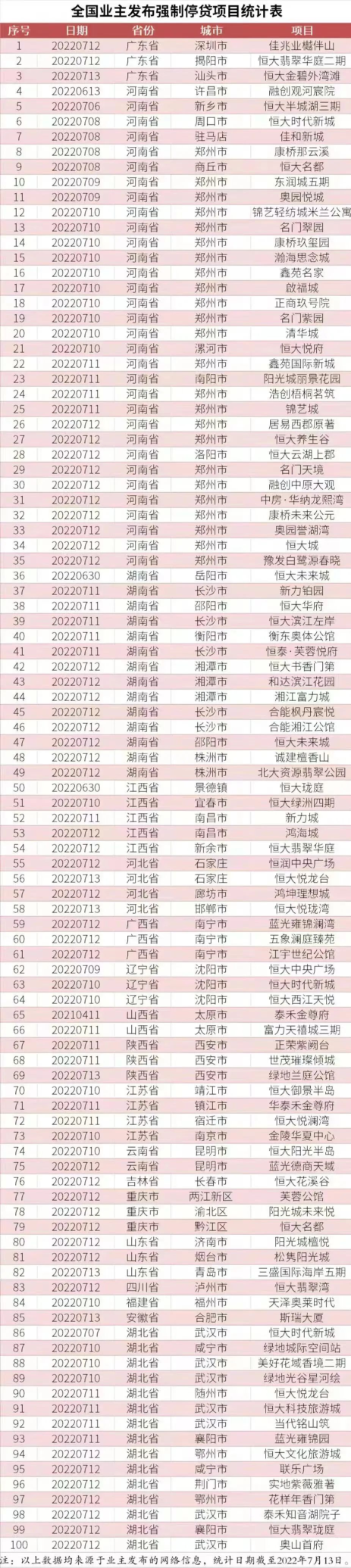 在微博上,流传着一份强制停贷项目统计表。从表单中可以看到,停贷楼盘已经达到100个,还在不停地增长中。从地区看,河南烂尾楼盘最多,有32个。从企业看,恒大烂尾楼盘排名第一,有34个。
