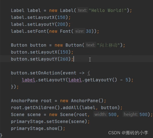在学习FXML之前,我们的代码都是直接写在类里面的,比方实现一个点击按钮字体移动的效果,我们以前写的代码如下: