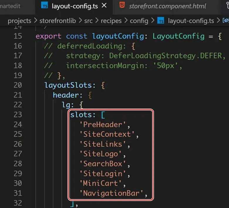 - Slots(插槽)配置: 文件中常见的配置项之一是插槽(slots)。插槽定义了 storefront 页面中的不同区域,开发者可以在这些区域中添加自定义的组件或调整默认组件的位置。这使得页面的结构可以根据具体业务需要进行调整。