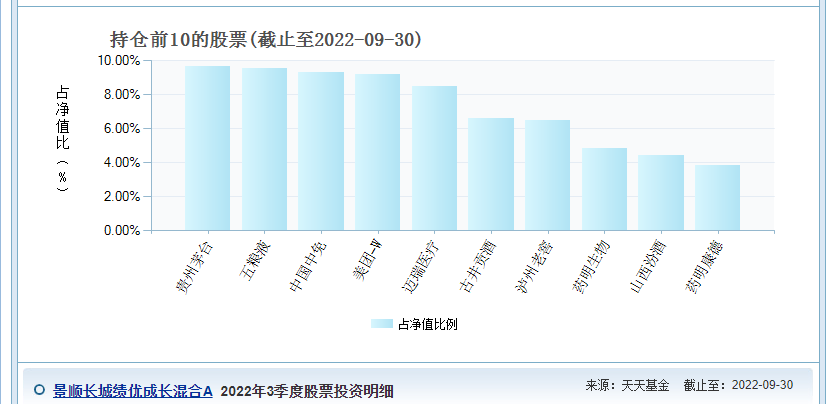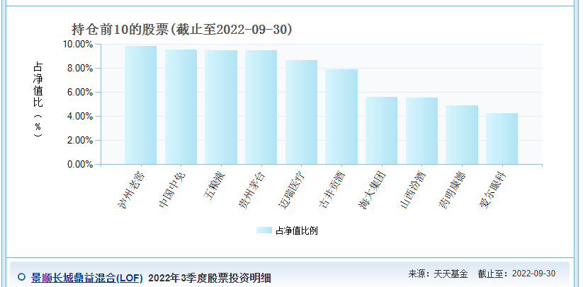 从2020年年底到2022年三季末,这只基金的持仓组合前十又出现了一些变化,茅五泸汾依旧是核心组合,中免集团(601888.SH)、海大集团、迈瑞医疗(300760.SZ)得以保留,晨光股份(603899.SH)、恒瑞医药(600276.SH)、伊利股份(600887.SH)出局,增加了二线名酒古井贡(000596.SZ)以及药明康德(603259.SH)、爱尔眼科(300015.SZ)。