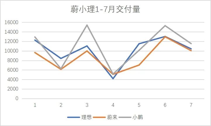 相比此前的腰部势力交付量走势,除了2、4月以外,蔚小理三家在7月集体“低头”。虽然仍然保持过万的月交付能力,但在环比来看都处于下降状态。