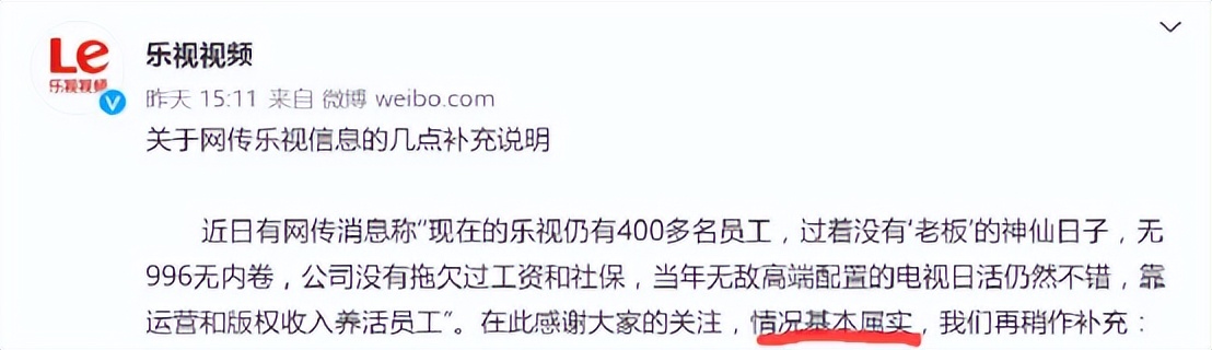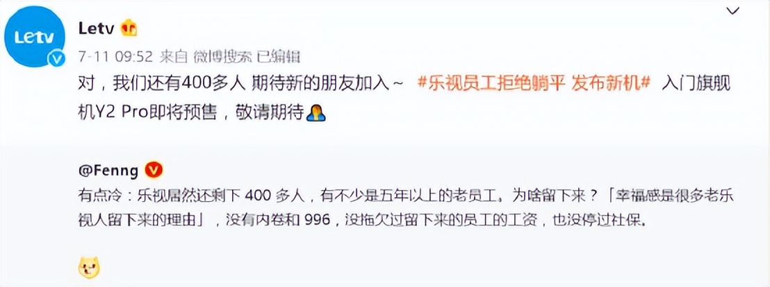 2022年7月11日,因一名大V的爆料“乐视仍有400名员工……”被乐视官方账号转发,引舆情发酵,7月12日,乐视趁热打铁,又针对网传信息做了补充说明,并着重强调“乐视仍有400多员员工,过着没有老板的神仙日子,无996无内卷,公司没拖欠过工资和社保”等基本都属实,引发热议。