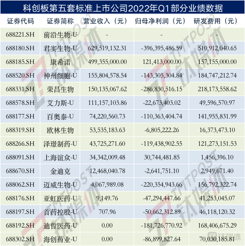 截至发稿,科创板通过第五套标准上市的公司共有16家,目前公布2022年一季报的15家公司中,收入不过亿元的有10家,占比过半。与此同时,归母净利润为正的仅有新冠疫苗热门企业康希诺(688185.SH)一家,其余均为亏损。而这些低创收、大亏损的公司在研发投入上均是大手笔,其中Q1研发费用过亿元的有8家。