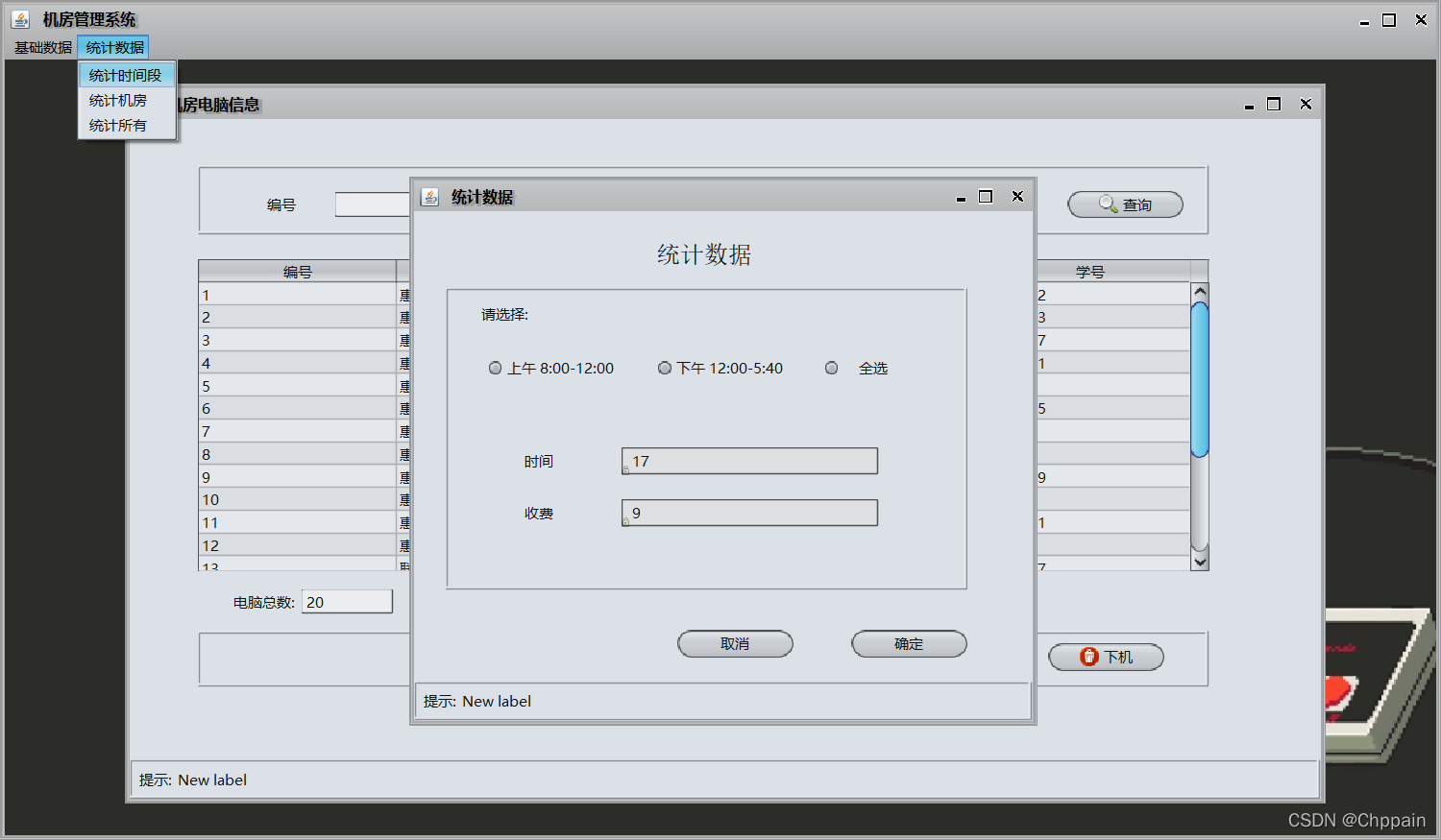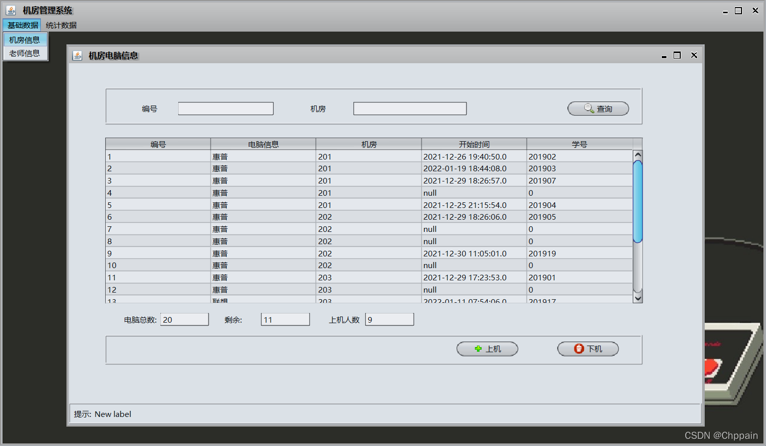 实现上机管理,包括机房名称、在用电脑信息、已上机时长和使用人员信息、 和各个机房空闲电脑数量等;