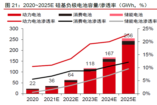 理论上,硅基负极材料的比容量可以高达 4200mAh/g,是石墨负极理论极限的近 12 倍,也是目前已知比容量最高的电池负极材料。即便是目前仅仅小规模应用的硅碳负极和硅氧负极材料,实际比容量也分别达到了 450mAh/g 和 450~500mAh/g。