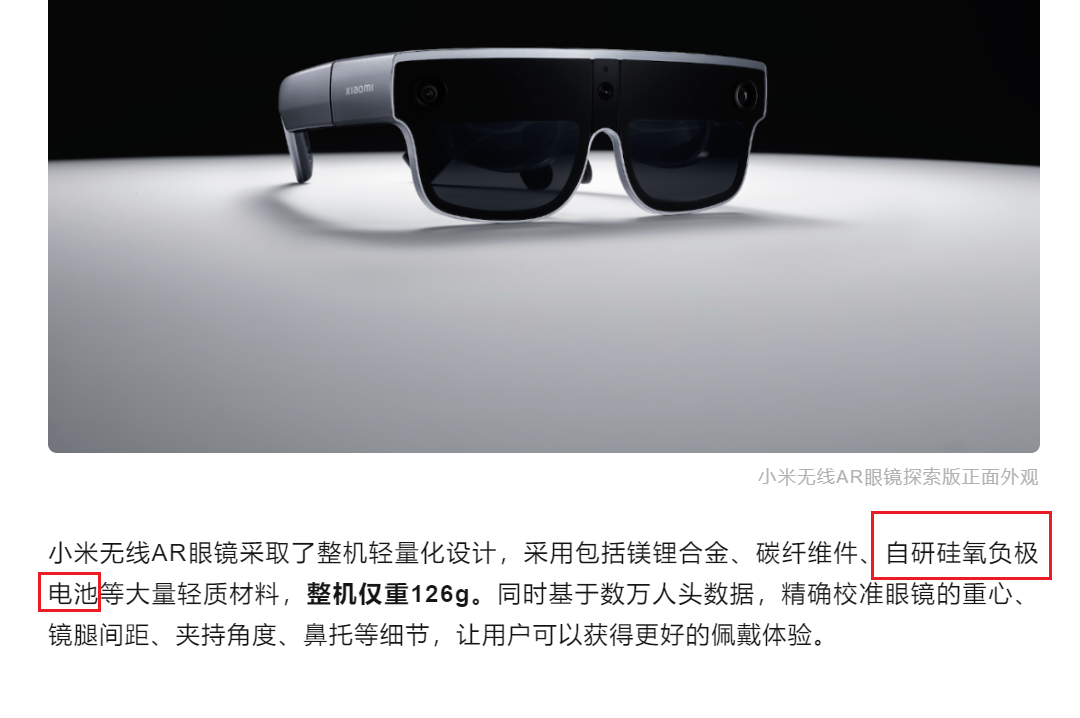 在这两个方面,另一家手机厂商——小米其实很早就有了尝试。早在 2019 年,小米在概念机 MIX Alpha 上采用了硅碳负极电池,电池容量达到 4050mAh。而在小米 11 Pro 和 Ultra 上,小米开始采用硅氧负极电池,最新亮相的小米真无线 AR 眼镜中,官方同样也提到了搭载「硅氧负极电池」。