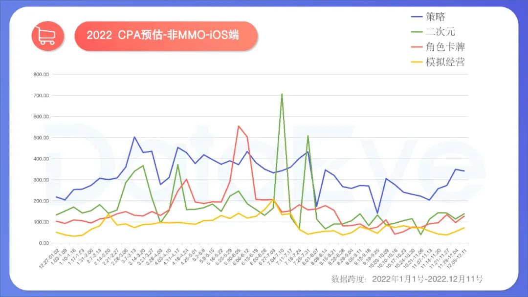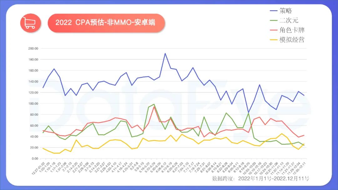 ** 策略赛道结束巨头大战,卡牌、二次元偶有高峰,模拟经营价格较低。** 策略:一季度,4XSLG赛道投放量居前的产品,囊括了阿里、网易、腾讯、莉莉丝、4399、FunPlus,可谓凑齐了游戏行业的大半壁江山,特别是《文明与征服》《重返帝国》上半年素材投放量凶猛,将CPA价格推至最高500元/A的局面,下半年群雄争霸结束,演变成三七《小小蚁国》与君趣《蚁族崛起:神树之战》的双雄之争,CPA价格虽然有所下滑,但仍然较高。 二次元:今年二次元总体生存环境艰辛,加之并不依赖买量,总体CPA价格并不高,但却会因为个别产品(如《云上城之歌》《闪烁之光》)突然加大投放,导致价格上升。10月以来,二次元双端CPA价格总体走低,赛道集中化趋势异常明显。 模拟经营:价格相对其它赛道偏低,全年维持较为平稳水平。