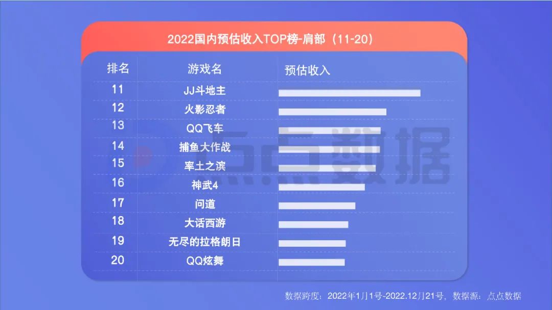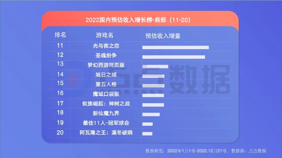 ** TOP20腾讯网易占13席,《王者荣耀》仍是国民级存在。**2022年国内累计收入情况方面,TOP20中腾讯系占据8席、网易占据5席,仍是绝对的巨头霸主。