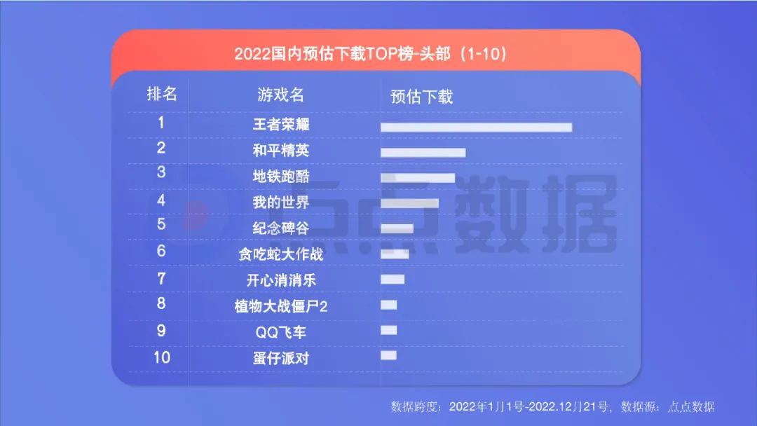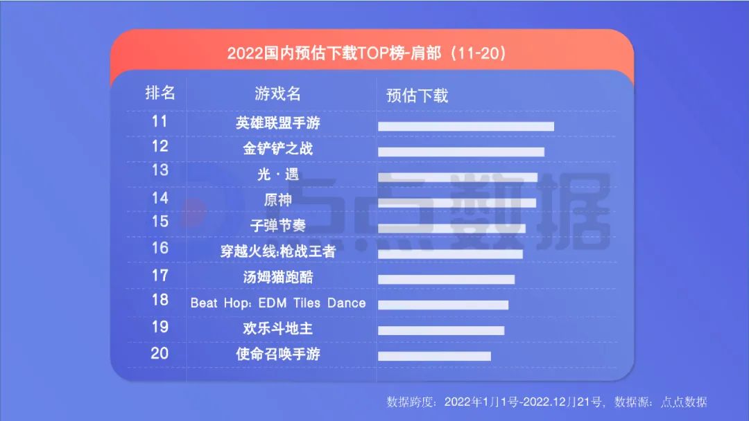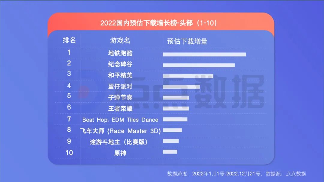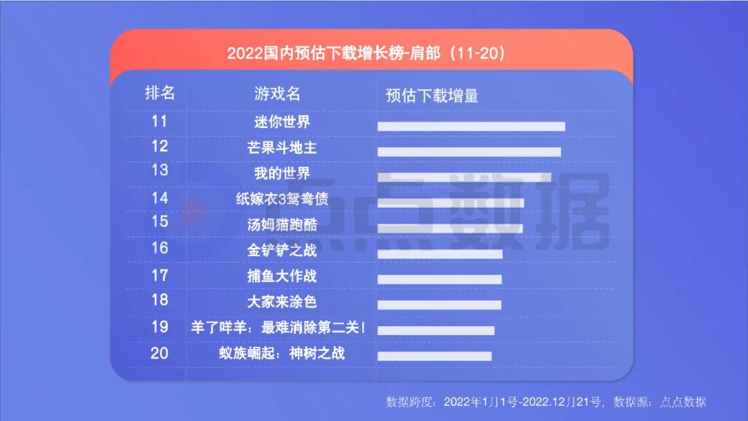 ** 老游戏引发大量下载。下载类榜单同样有更多“老面孔”,这一方面反映出精品化趋势下,长线运营导致玩家回流;另一方面反映出新游数量少、大多吸量不佳,玩家迁移意愿低。《王者荣耀》《和平精英》的社交属性,让不少玩家“删了又下、下了又删”导致下载量名列前茅。 ** 中轻度、“怀旧型”产品亮眼。下载类榜单出现了更多中轻度产品。《地铁跑酷》位列下载量TOP3堪称2022一大现象级手游。让人哭笑不得的是,《羊了个羊》的爆火,让山寨产品《羊了咩羊:最难消除第二关!》挤进下载增长榜TOP19。同时,一些“怀旧”产品也表现出色,如《贪吃蛇大作战》《植物大战僵尸2》。
