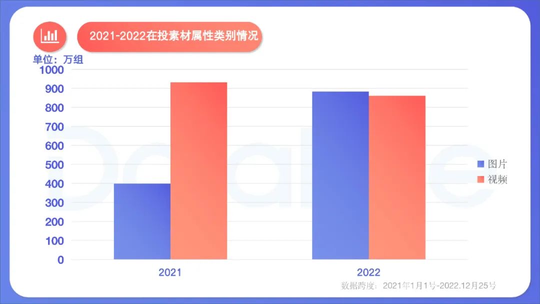 2、低成本素材增加,如图片素材量大幅增长,视频素材投放量略微缩减,其中成本较高的品牌类广告片、真人实拍大幅减少;