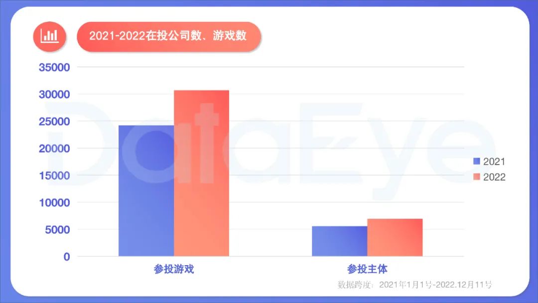 ** 参投游戏数增幅,略高于参投公司数增幅。**2022年参投游戏数增长26.7%,高于参投主体数的增长24.2%。今年虽然版号恢复发放,但总量有限,如此程度的游戏数增幅,主要因为: