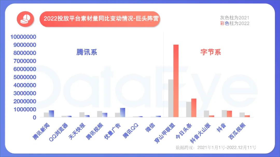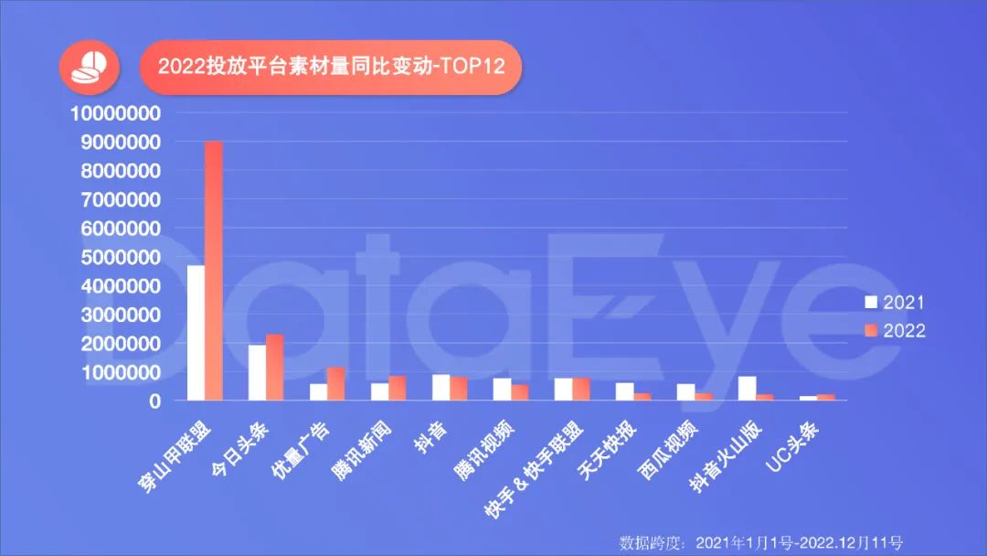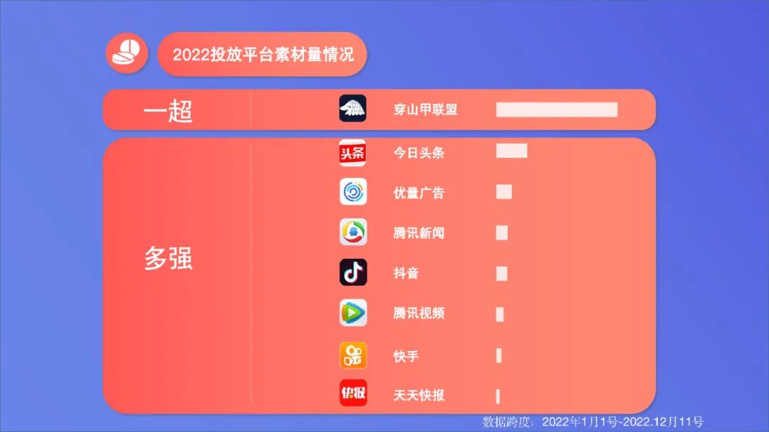 ** “一超多强”格局延续,梯队差距扩大。**2022投放平台方面,穿山甲联盟“一超”、今日头条、优量广告、腾讯新闻、抖音等“多强”的局面延续,且穿山甲联盟素材量同比大幅增长91.9%,拉开与其它平台差距。