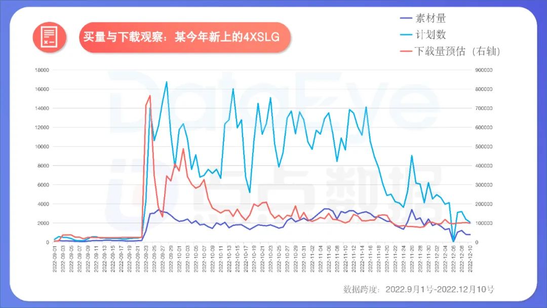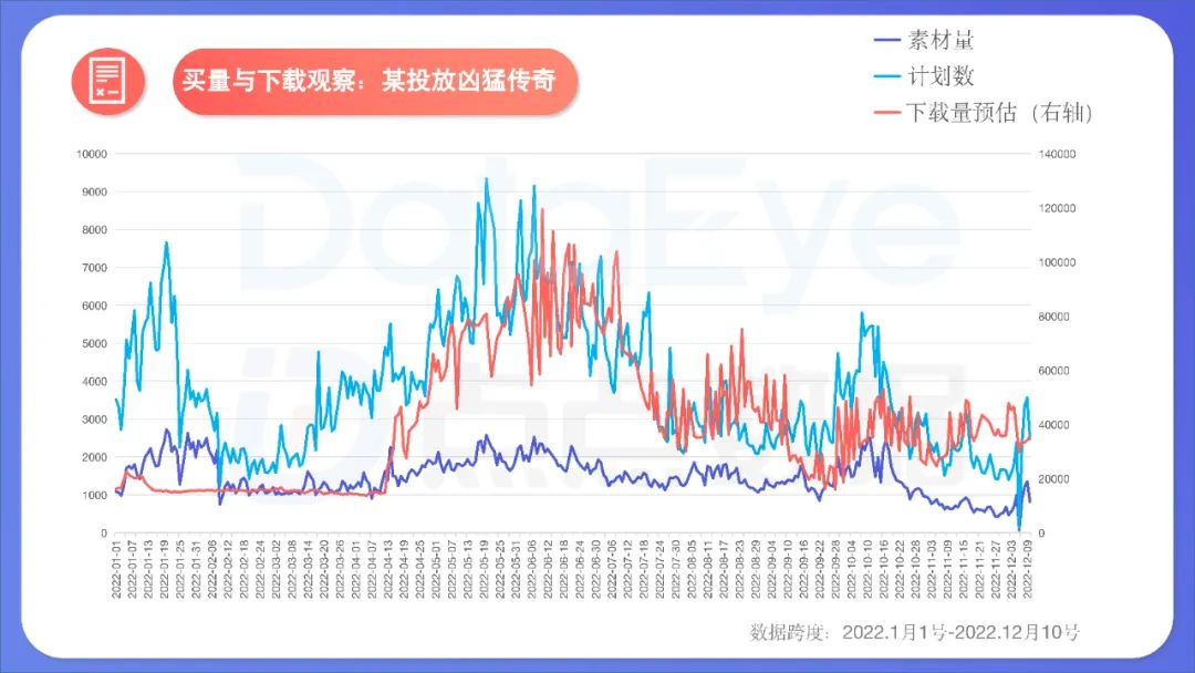 这可能是行业首次,DataEye研究院尝试将下载与买量情况,置于同一坐标轴中观察,以判断买量对该游戏下载的影响、买量效率、“品效”抉择、营销决策。