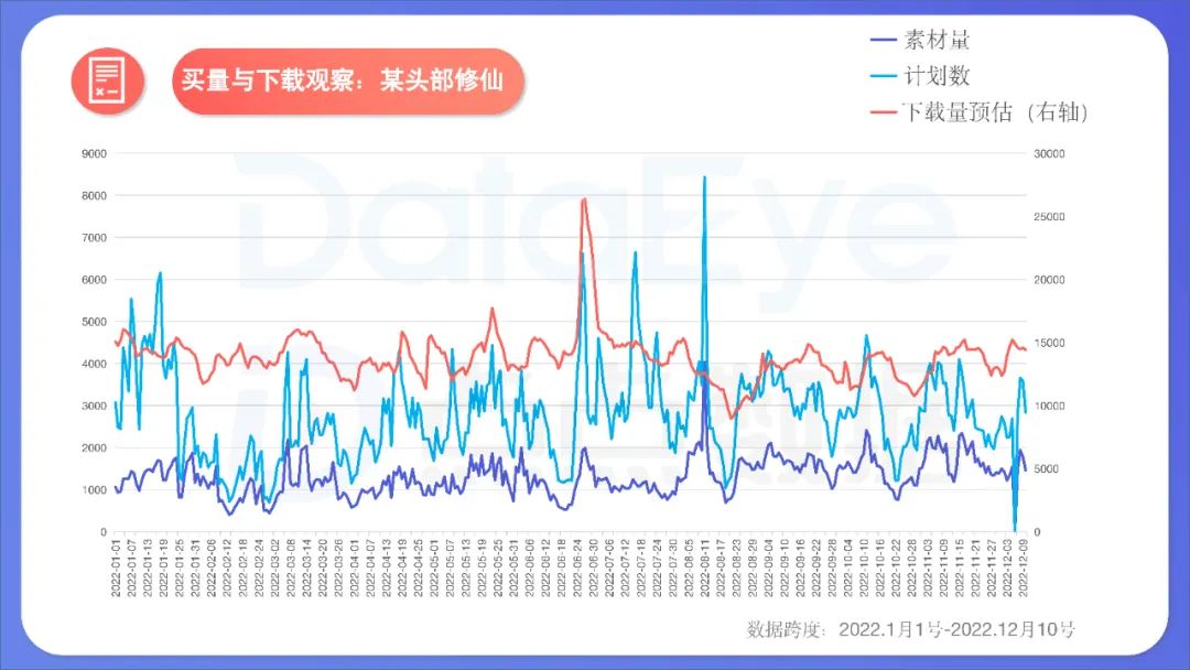 ** ↑案例三:严控买量节奏、素材、价格,观测“可持续买量”。**该游戏是一款融合创新的修仙产品。作为买量大户,总体买量、下载量节奏却较为稳健,只有个别版更期的波动。该游戏有什么持续买量的秘密呢?
