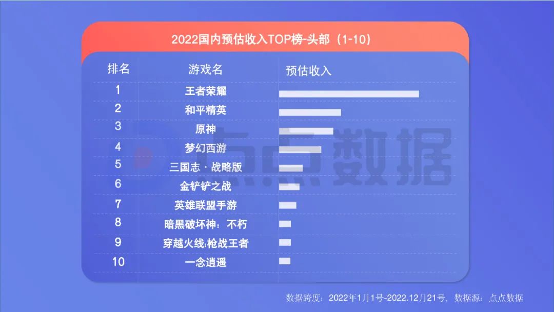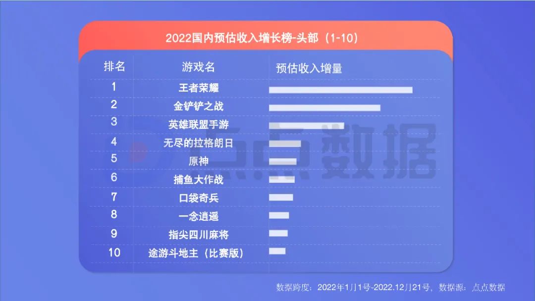腾讯方面,《王者荣耀》在收入体量、收入增量上都仍是绝对霸主,国民级地位无可动摇。同为腾讯系新上线的《金铲铲之战》《英雄联盟手游》挤进收入TOP10。