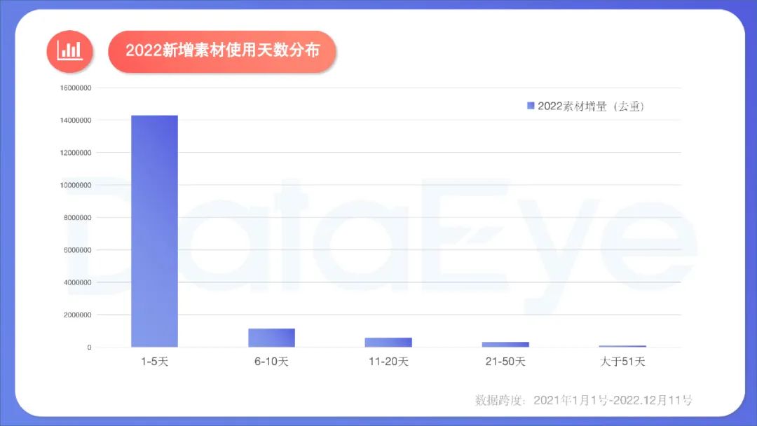 2、效率:单个素材使用效率较低,今年新增素材投放超过11天(含)的,仅占5.87%,单个素材平均使用天数约3.7天;