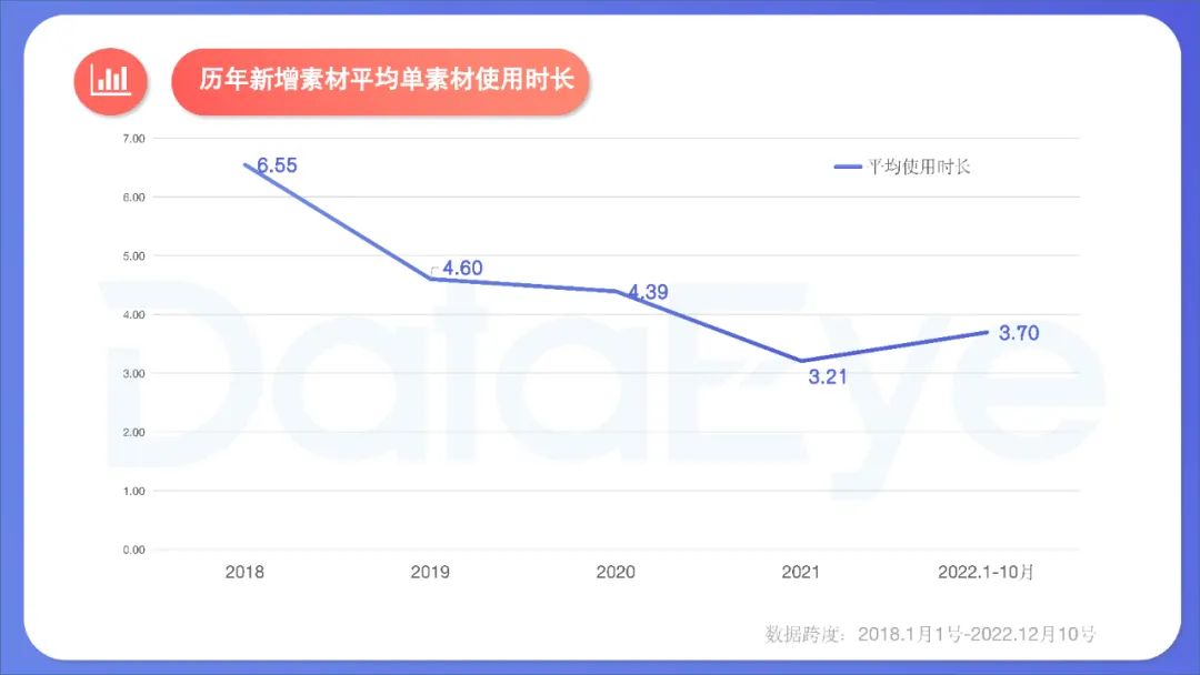** 单个素材使用效率较低。**截至今年10月,今年新增素材中(去年投放沿用至今年的不算),单个素材平均使用天数约3.7天,较2021年全年的3.2天略有增长,但相较此前仍属于较低水平。累计投放1-5天(含)的占87.16%,超过11天(含)的新增素材,仅占5.87%。素材使用效率较低,主要因为: