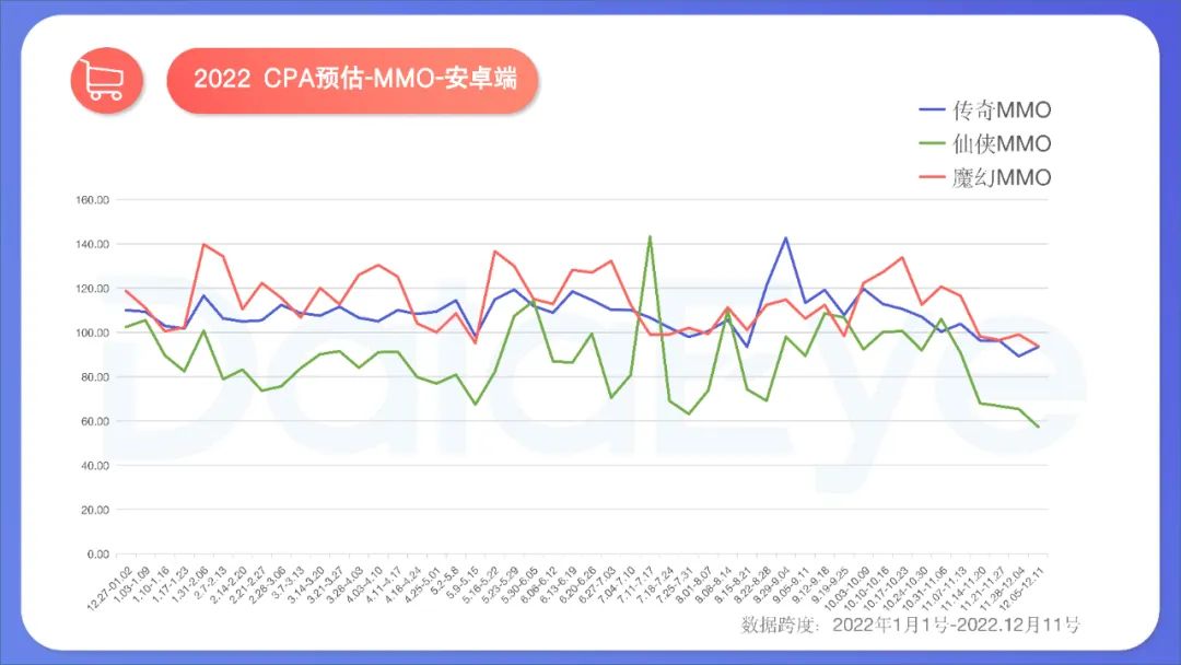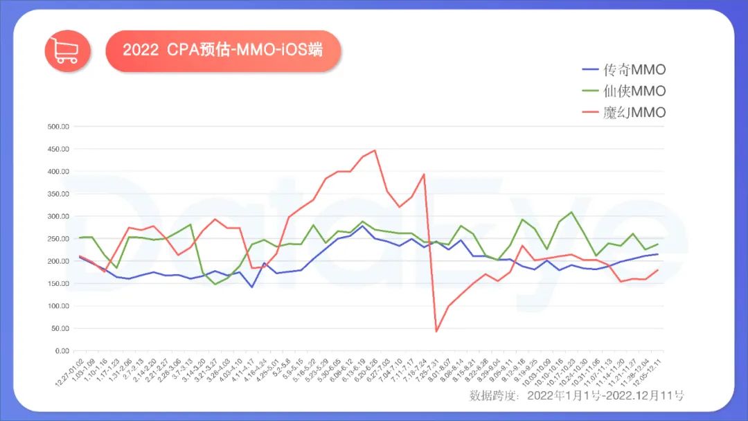 **价格****总体平稳、维持高位,魔幻iOS端价格波动较大。**2022年MMO赛道各题材买量CPA价格总体维持高位,侧面印证竞争激烈——“你不买,总有人愿意买”。价格提升的高峰,往往出现在“淡季”(如过年后、开学后导致用户流失,故而需要补充),或是某些产品入市推升。分客户端来看:
