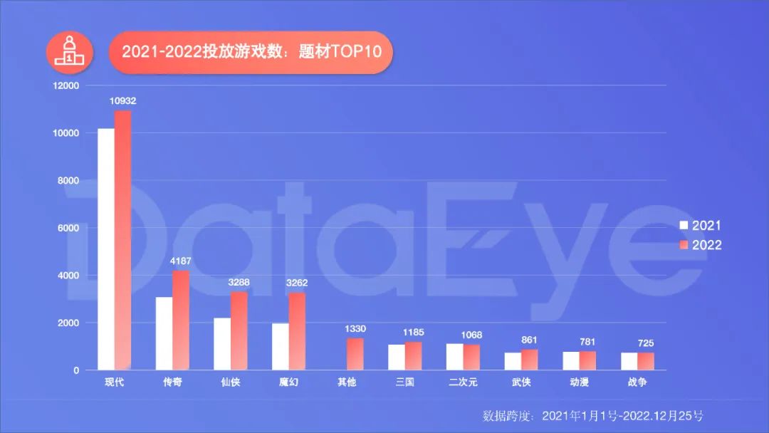 ** 魔幻、仙侠、传奇游戏数增长明显,二次元减少。**2022年参投游戏中,各类题材数量排序与去年基本一致,现代题材游戏近1.09万个,继续维持绝对榜首的稳固地位。今年一些新变化在于: