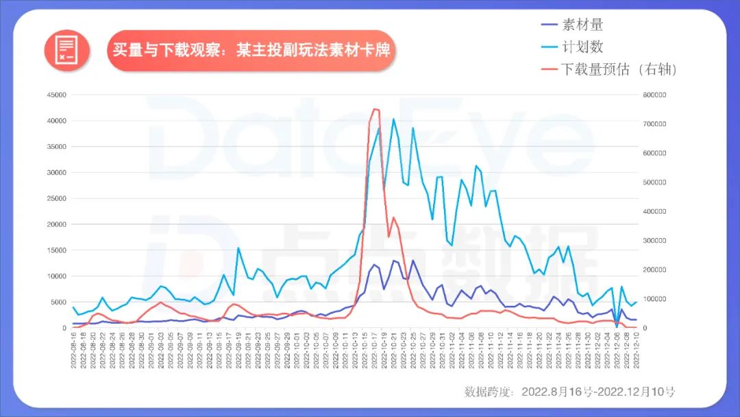 ** ↑案例五:副玩法素材初期吸量,但边际效应快速递减。**该游戏是今年“现象级”买量产品,副玩法/小游戏素材的大量投放,让该游戏10月持续霸榜。然而,如图所示:天蓝色线与红线之间的面积(即获量效率)逐渐扩大,最终买量投放再难带动下载量的高增长。投放、下载双双走向全年低位。 这一案例说明:副玩法/小游戏初期非常吸量(爆量效率较高),但边际效应快速递减,这主要因为: 1、素材大量投放,潜在用户“上当”一次后便了解套路; 2、副玩法套路极易被抄,加速素材失效,行业级副玩法素材从爆量到失效,对于一款游戏而言是只需短短1、2个月。