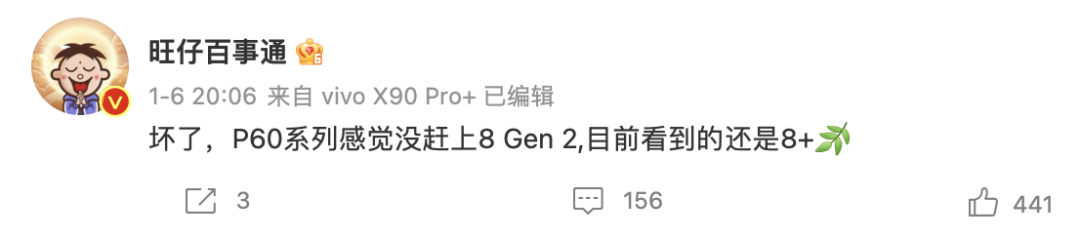 不过,数码博主@旺仔百事通表示,P60 Pro没赶上最新的骁龙8 Gen 2芯片,很可能搭载的还是骁龙8+,如果传言是真的,那属实遗憾。