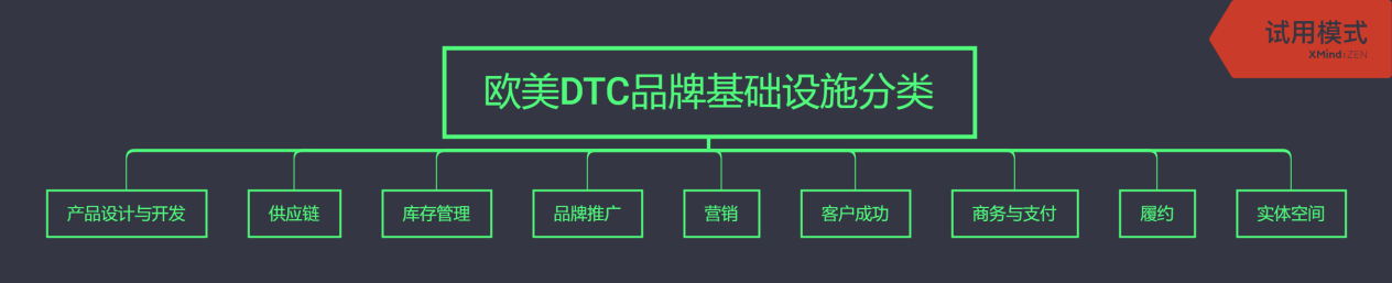 其实,DTC品牌模式的变化并非突然发生。中国DTC品牌核心竞争对手并不在国内,早在10年前,欧美DTC品牌概念就已经经历了一轮热潮与降温。下图可以清晰看到欧美DTC品牌基础设施分类,这一系列(从产品设计开发、供应链、库存管理、品牌推广、营销、客户成功、商务支付、履约、实体空间)在欧美都已形成十分全面的生态支持。