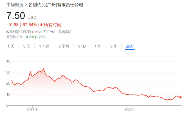不过随后,名创优品的股价开始“跌跌不休”,截至美东时间7月7日收盘,其股价仅剩7.5 美元/股,较高点下跌超78%。