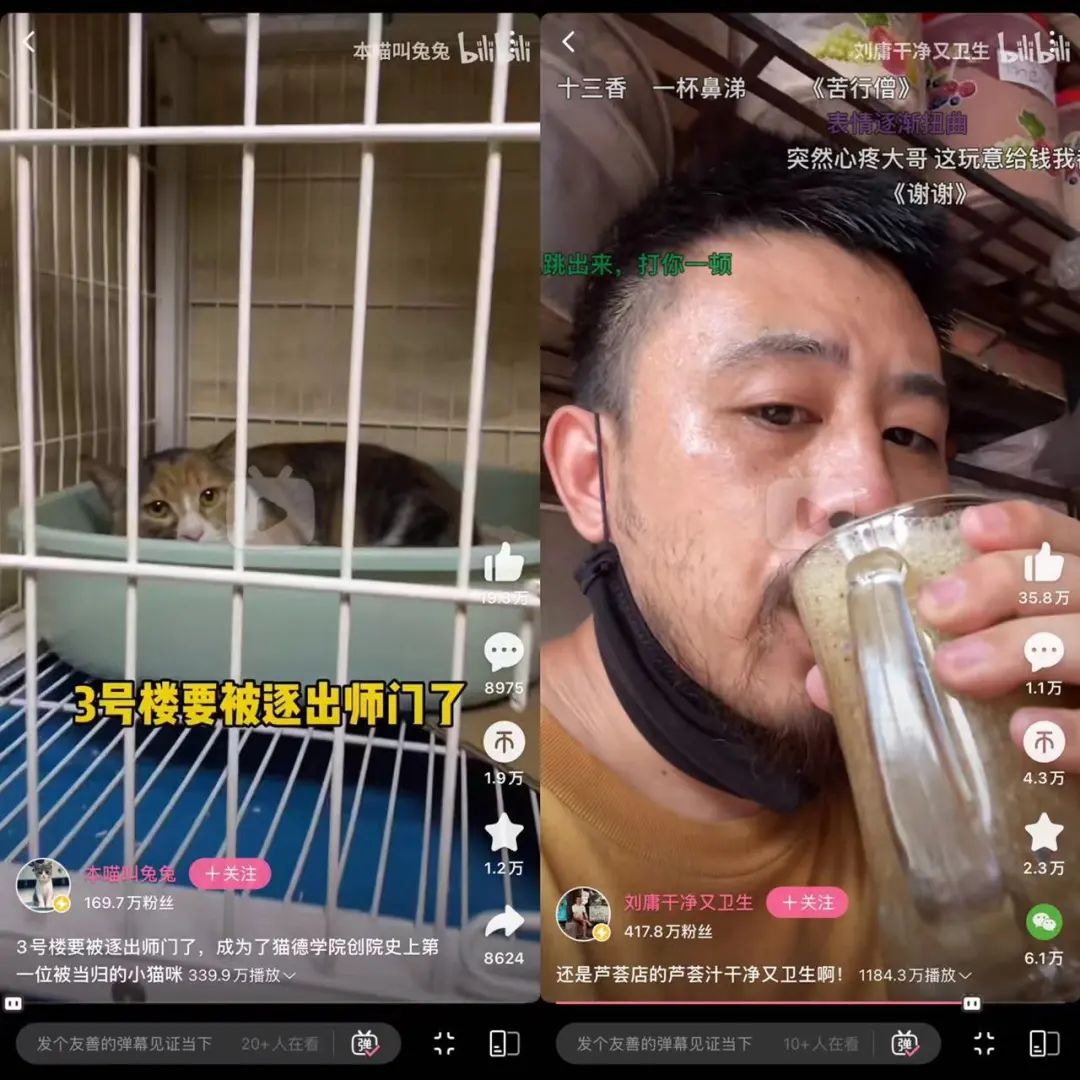 同时,我也没有刷到太多来自 B 站大 UP 主(尤其是百大 UP 主)的竖屏内容,里面比较特别的是 @本喵叫兔兔 和 @刘墉干净又卫生,这是近两年在 B 站和抖音等平台快速成长起来的短视频 UP 主,以简单小故事和非常有记忆点的口头禅打入观众,成为了互联网文化的一部分。比如,现在看到不乖的野猫,大家都会叫它“三号楼”,就是来自于 @本喵叫兔兔。
