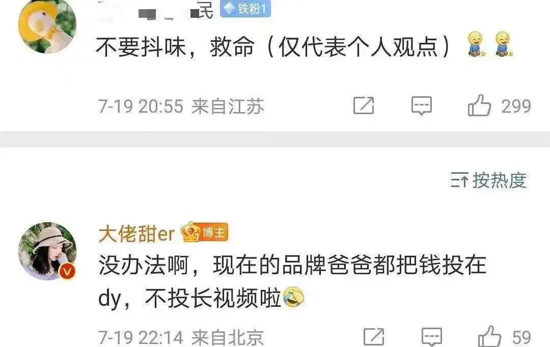 在 B 站上拥有 147 万粉丝的 UP 主“大佬甜 er”,最近收到了很多老粉吐槽,希望她能够多出她们之前喜爱的,逐步教化妆的长视频,少出“ dy 化”的短视频。大佬甜 er 显然比较无奈,回复称,“没办法啊,现在的品牌爸爸都把钱投在 dy(抖音),不投长视频啦。”