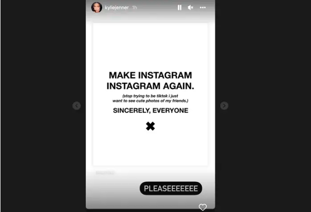 这样的举动深深冒犯了用户:为什么信息流里出现了我不认识的人?之前 Instagram 不是已经有“发现”页面了吗?Instagram 上最重要的 KOL 之一,卡戴珊家族的小妹 Kendall Jenner 率先呼吁:“让 Instagram 重回 Instagram!(停止试图成为 TikTok,我只想在 Instagram 上看我朋友发的可爱图片)”。