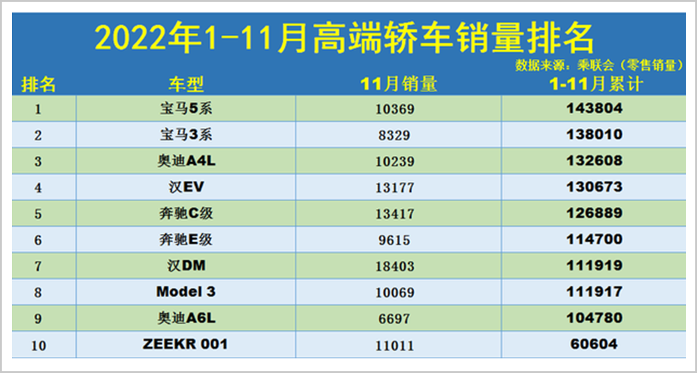 乘联会数据显示,2022年1-11月,中国新能源汽车厂商销量TOP3依次为:比亚迪、上汽通用五菱、特斯拉,其销量分别为157.63万辆、40.33万辆、39.78万辆,同比增长分别为220.9%、7.1%、59%,市场份额分别为31.3%、8%、7.9%。