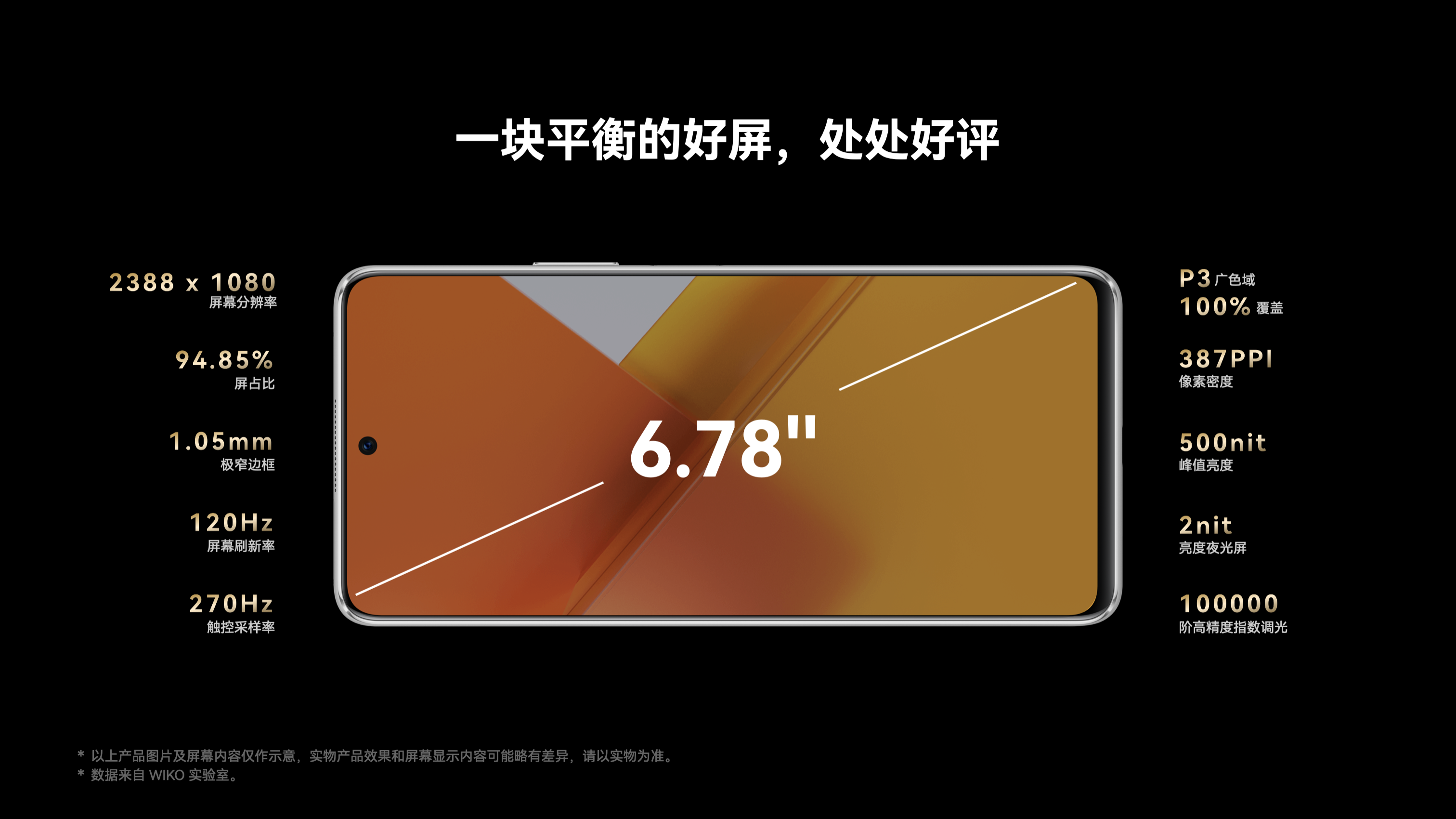 设计方面,WIKO 5G具备曜黑和秘银两种配色。在屏幕的选择和调校上,WIKO 5G采用了6.78英寸LCD屏幕,支持P3广色域,最高刷新率120Hz,具备270Hz触控采样率。同时屏幕也支持万阶调光技术,能够根据环境光亮度自动调整屏幕亮度,带来更舒适的观阅体验。