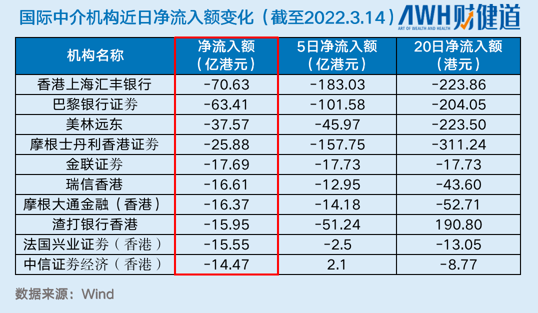 以跌幅较为显著的3月14日为例,东方财富choice金融数据显示,当日流出资金额度前五的机构,其20日资金流出总量均达到200亿港元之上。