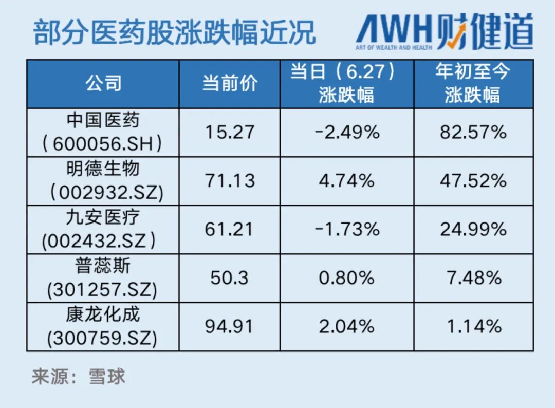 截至6月27日收盘,医药板块多股涨幅明显,年初至今涨幅更上一层楼。“一哥”恒瑞医药(600276.SH)当日涨幅为6.09%,为近一个月以来股价最高点,微创医疗(00853.HK)今日涨幅超7%,同样站上近期股价高位。