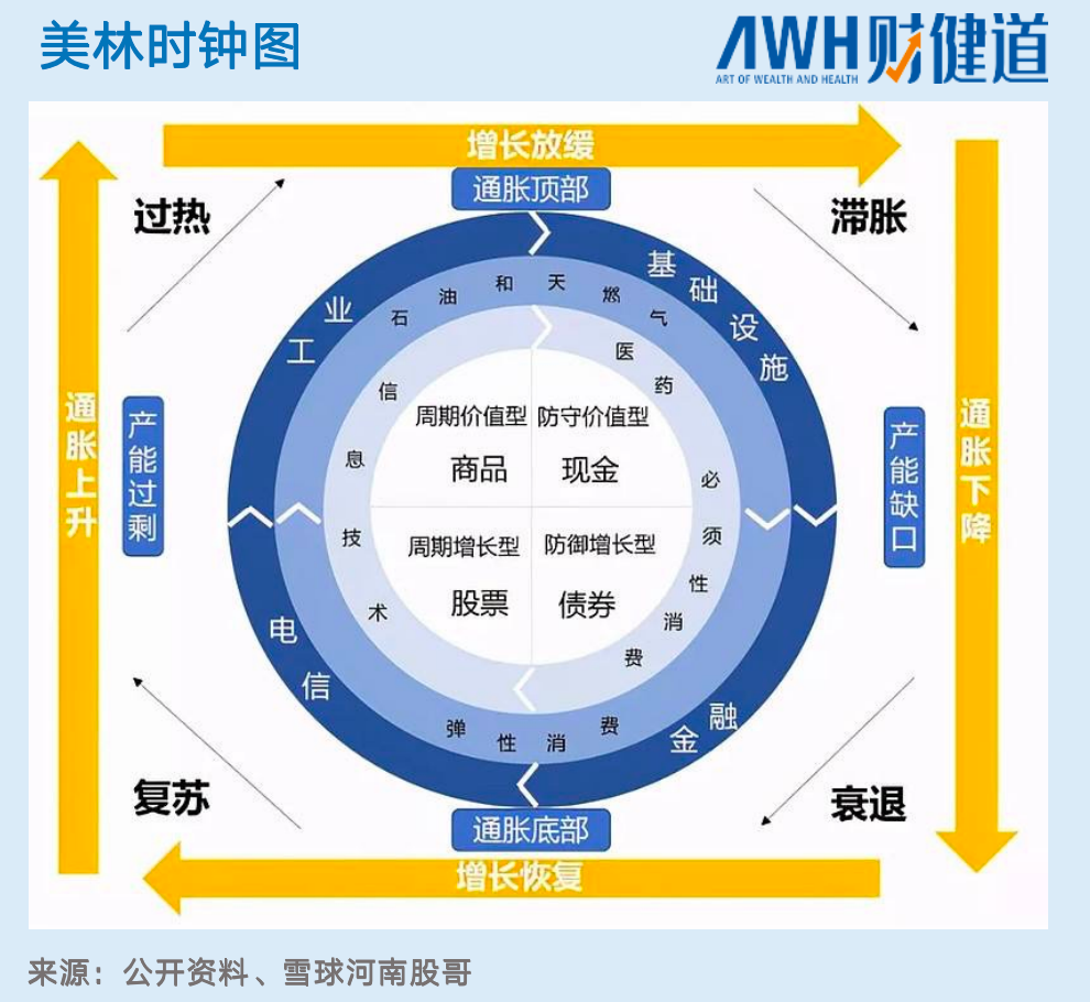 “美林时钟”理论把经济周期分为四个阶段:衰退、复苏、过热、滞涨。滞涨说的是经济下跌、通货膨胀大幅上涨。医药板块的走势跟经济环境的轮转自然密不可分。