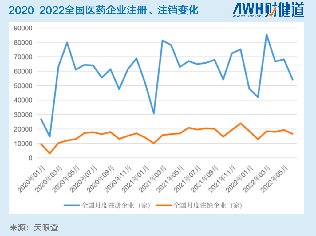 从全国各地医药企业注册数量和注销数量也可以看出,疫情以来医药企业注册数量略有起伏,但注销数量一直相对平缓,即使在疫情防控期间,也并未出现急剧上升的走势。