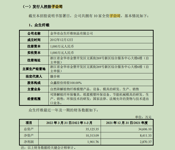 例如,2020年11月18日,众鑫股份注册成立海南甘浙君环保科技有限公司,该公司实收资本为500万元,海南甘浙君环保科技有限公司的主营业务为自然降解植物纤维模塑产品的销售等。同年12月,众鑫股份又成立兰溪市众鑫寰宇包装有限公司,该公司主营业务系纸和纸板容器制造、包装服务等,实收资本为100万元。