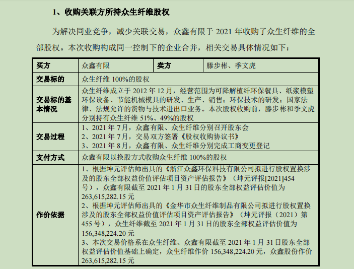 具体来看,2021年7月,众鑫有限(系众鑫股份前身)与众生纤维签署《股权收购协议书》,以换股方式收购众生纤维100%的股权,当时交易价格系在众生纤维、众鑫股份截至2021年1月31日股东全部权益评估价值基础上确定,众生纤维作价约1.56亿元,众鑫股份作价约2.64亿元。2021年8月,众生纤维完成工商变更登记。
